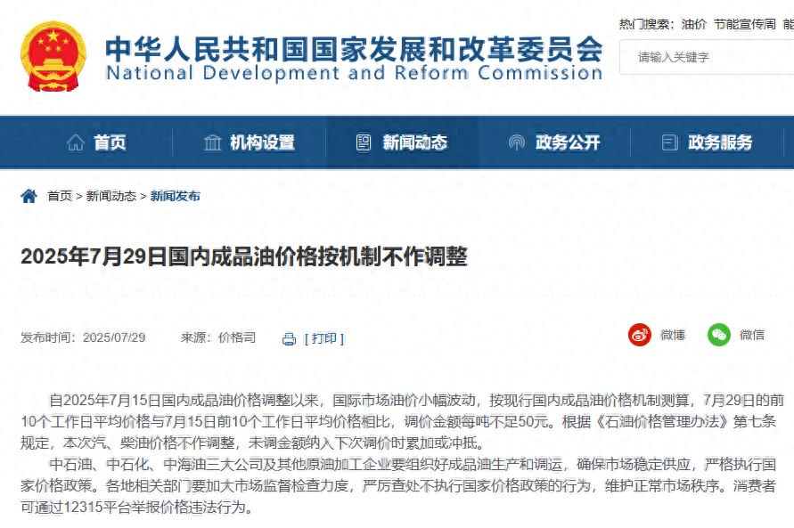中新经纬7月29日电 据国家发改委网站29日消息,自2025年7月15日国内成品油价格调整以来,国际市场油价小幅波动,按现行国内成品油价格机制测算,7月29日的前10个工作日平均价格与7月15日前10个工作日平均价格相比,调价金额每吨不足50元。根据《石油价格管理办法》第七条规定,本次汽、柴油价格不作调整,未调金额纳入下次调价时累加或冲抵。