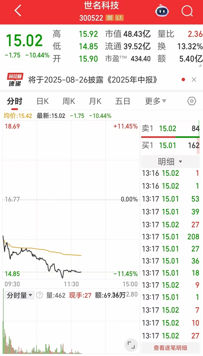 7月29日,世名科技(300522.SZ)走跌。截至发稿前,该股大跌超过10%,报15.02元/股,市值为48.43亿元。