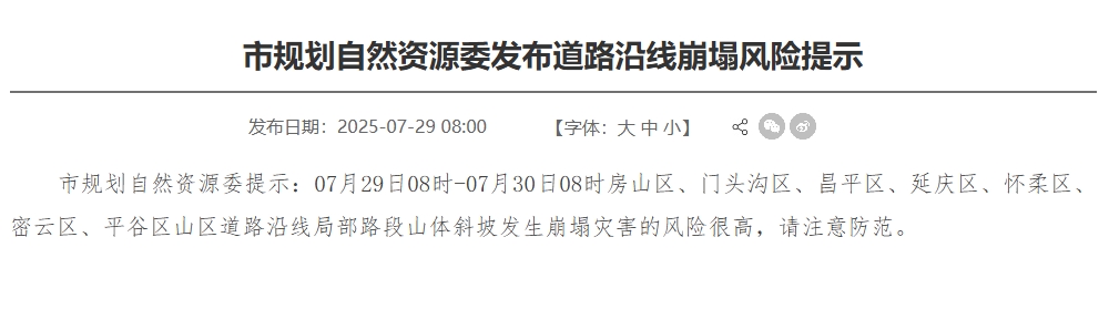 据北京市应急管理局网站消息,北京市规划自然资源委提示:7月29日8时至7月30日8时,房山区、门头沟区、昌平区、延庆区、怀柔区、密云区、平谷区山区道路沿线局部路段山体斜坡发生崩塌灾害的风险很高,请注意防范。