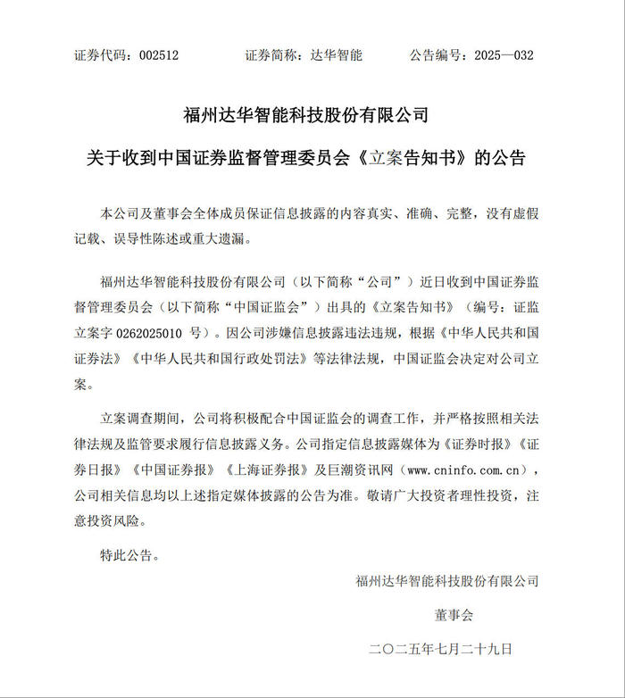 7月28日晚间,福州达华智能科技股份有限公司(证券简称:达华智能,股票代码:002512)发布公告称,因涉嫌信息披露违法违规,收到中国证监会出具的《立案告知书》;达华智能在公告中表示将 "积极配合调查并严格履行信息披露义务"。