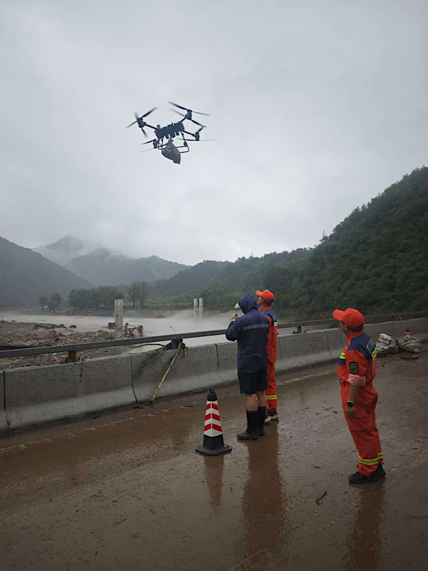 人民网北京7月28日电 (记者董兆瑞)7月28日,北京市应急管理局驰援9架无人机,为怀柔区琉璃庙镇受灾群众空投物资。上午11时,第一架无人机自琉璃庙镇安洲坝一桥起飞,携带食品饮用水等物资空投到前安岭村。