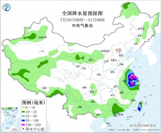 7月28日08时至29日08时,山西中北部、河北中北部、北京、天津中北部、辽宁西部、内蒙古中东部、陕西北部以及台湾岛、浙江东部、福建东部和南部、广东大部、江西南部、湖南南部、广西东部、海南岛西南部、西藏中南部等地的部分地区有大到暴雨,其中河北中部和东北部、北京北部、天津中北部、台湾岛西部等地的局部地区有大暴雨(100~200毫米)。新疆南疆盆地和东部、内蒙古中东部等地部分地区有5~6级风。东海大部海域、台湾以东洋面偏南海域、巴士海峡将有7~8级、阵风9级的大风,台风中心经过的附近海域风力可达9级、阵风10~11级。