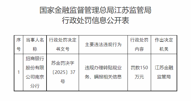 近日,国家金融监督管理总局江苏监管分局发布行政处罚信息显示,招商银行南京分行被国家金融监督管理总局江苏监管分局罚款150万元。