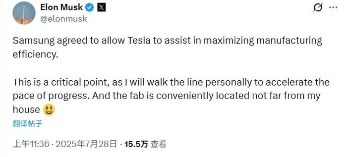 “三星已经同意让特斯拉协助最大限度地提高制造效率。 这是一个关键时刻,我会亲自督促,加快进度。而且晶圆厂离我家不远,很方便。”