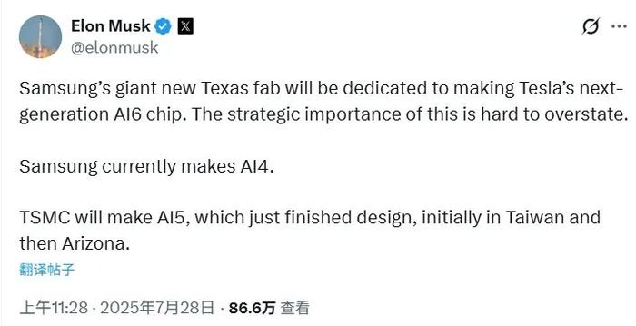 马斯克在社交平台X上连续发帖称:“三星在得克萨斯州新建的巨型工厂将专门用于生产特斯拉的下一代AI6芯片。其战略重要性毋庸置疑。”