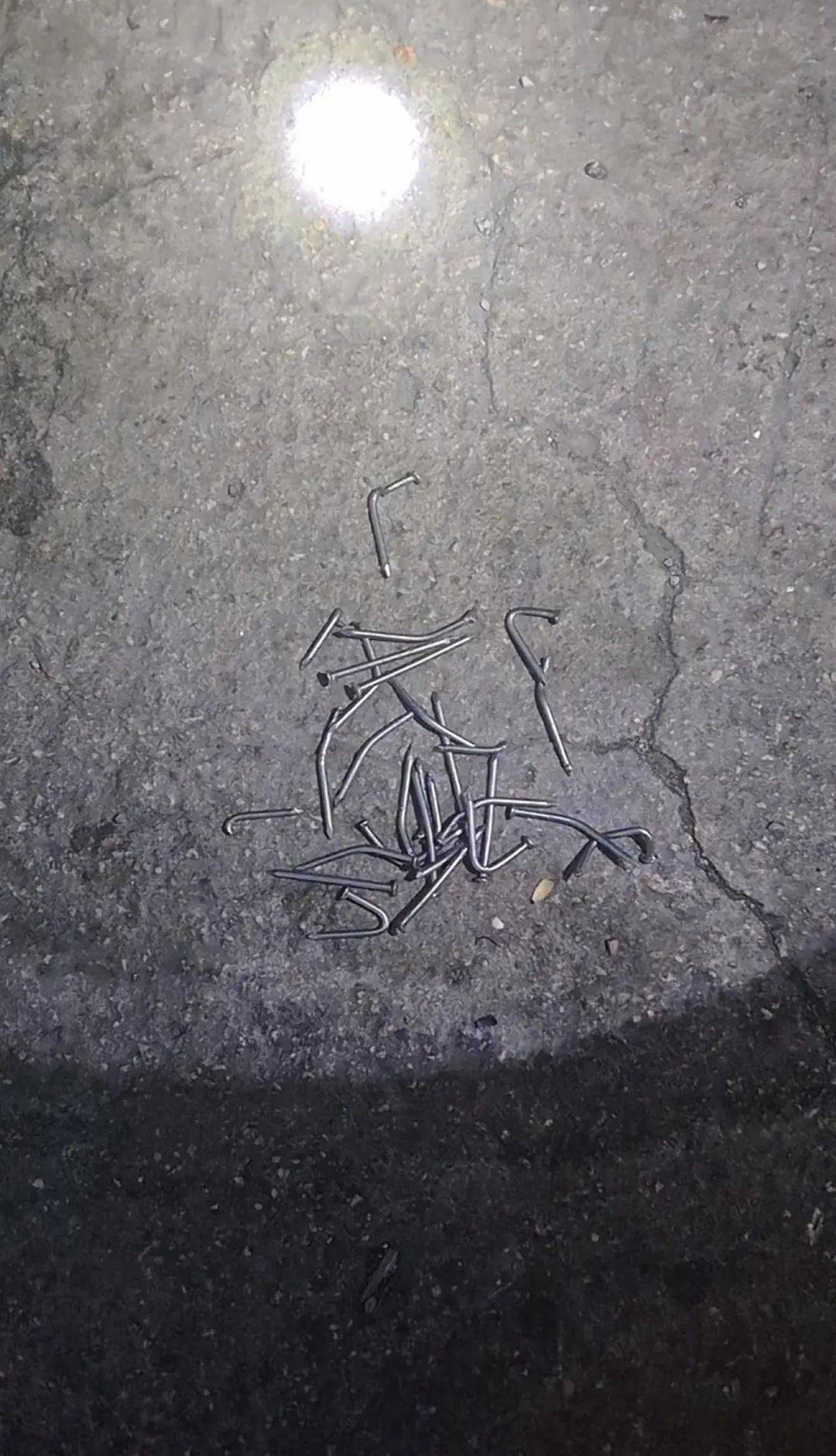 来自河南的卜女士昨天下午驾驶私家车经此路段,她向记者表示自己的车被扎了15颗钉子,“左后轮扎13颗,轮胎报废,更换新胎,左前轮扎1颗,右后轮扎1颗。”
