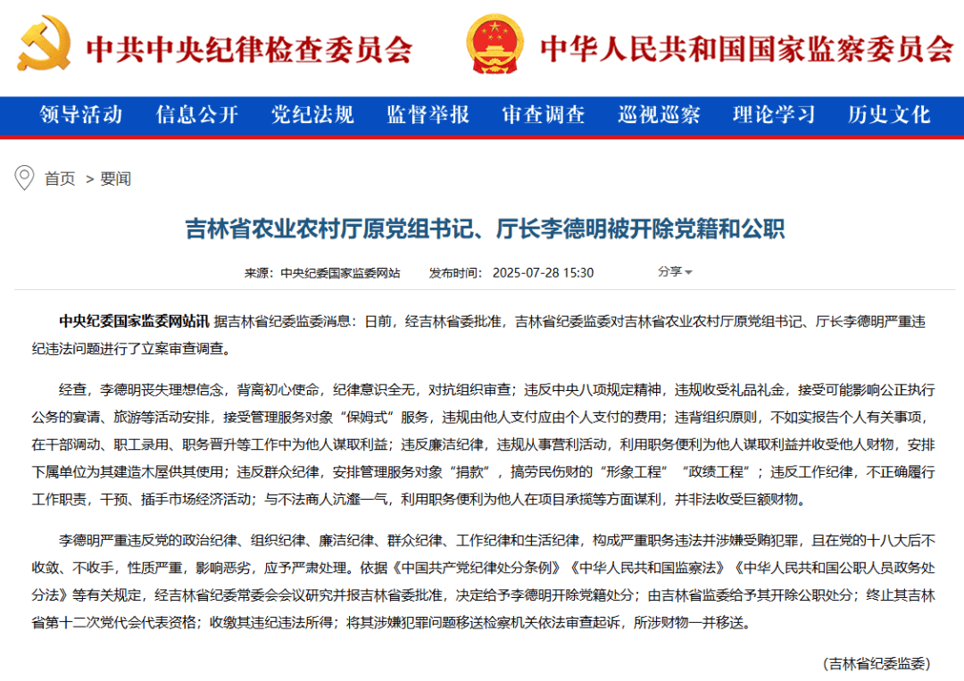 7月28日,中央纪委国家监委网站通报,据吉林省纪委监委消息:日前,经吉林省委批准,吉林省纪委监委对吉林省农业农村厅原党组书记、厅长李德明严重违纪违法问题进行了立案审查调查。