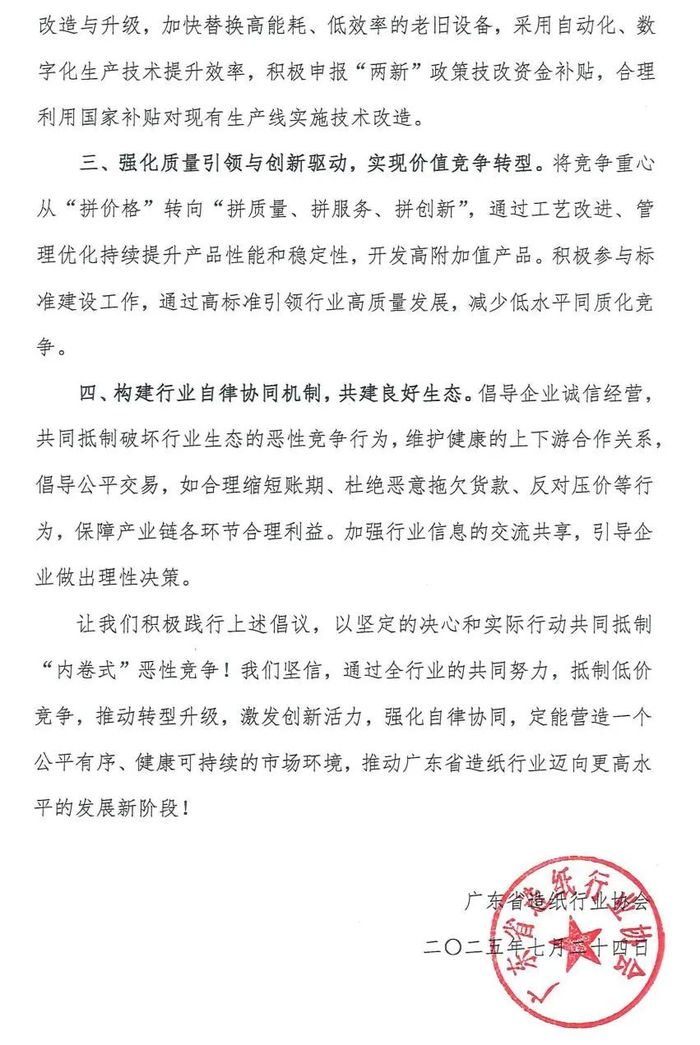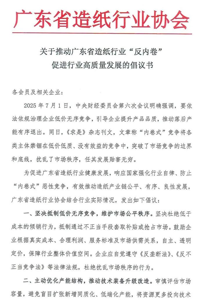 广东省造纸行业协会日前发布了《关于推动广东省造纸行业“反内卷”促进行业高质量发展的倡议书》。这也是国内造纸行业发出的第一封“反内卷”倡议书。其中提到,坚决抵制低价无序竞争,维护市场公平秩序。坚决杜绝低于成本的倾销行为,抵制通过不正当手段套取补贴或抢占市场。鼓励企业根据真实成本、合理利润、服务标准及市场供需关系,自主、透明定价,保障行业整体价值空间。