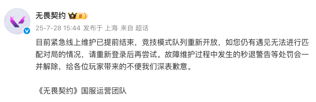 7月28日下午,《无畏契约》国服运营团队发布公告,“目前紧急线上维护已提前结束,竞技模式队列重新开放,如您仍有遇见无法进行匹配对局的情况,请重新登录后再尝试。故障维护过程中发生的秒退警告等处罚会一并解除,给各位玩家带来的不便我们深表歉意。”