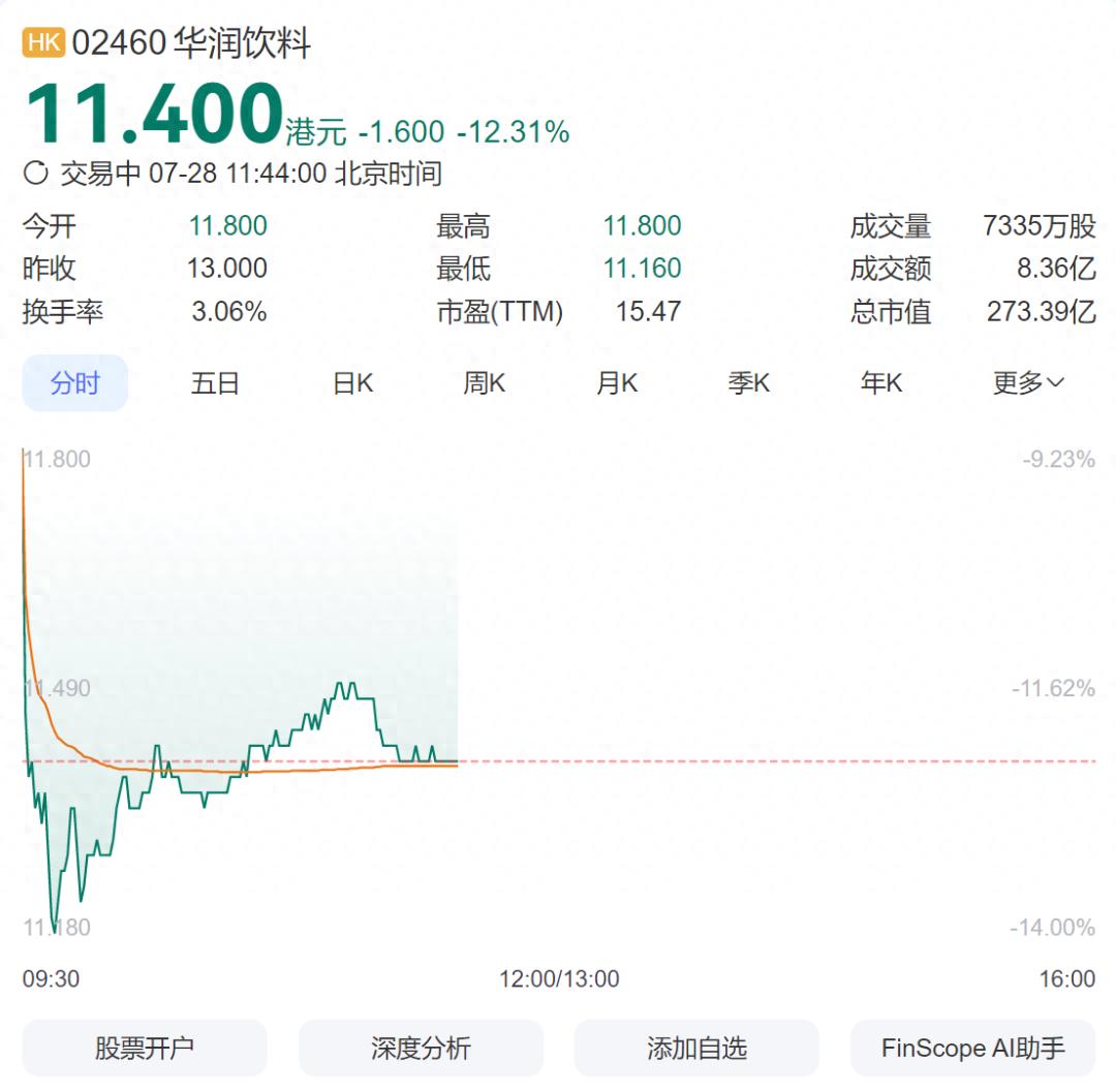截至发稿,华润饮料股价下跌12.31%,现报11.4港元。
