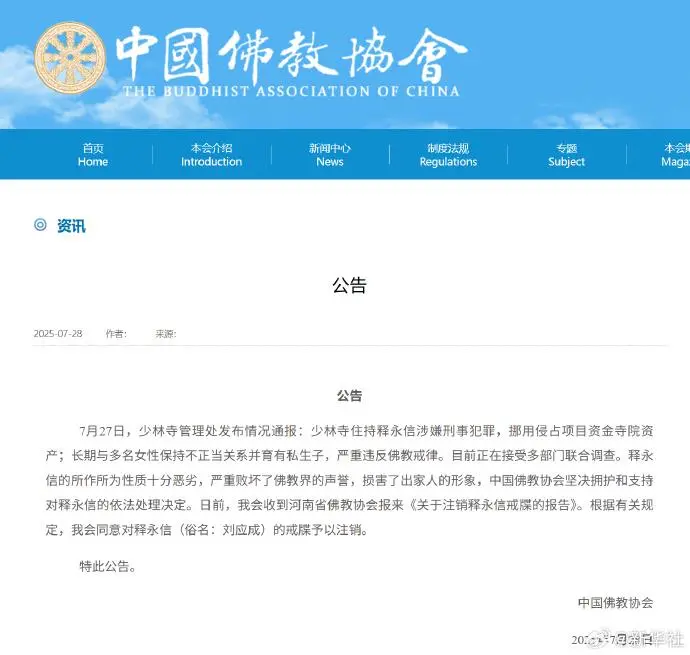 7月27日,少林寺管理处发布情况通报:少林寺住持释永信涉嫌刑事犯罪,挪用侵占项目资金寺院资产;长期与多名女性保持不正当关系并育有私生子,严重违反佛教戒律。目前正在接受多部门联合调查。释永信的所作所为性质十分恶劣,严重败坏了佛教界的声誉,损害了出家人的形象,中国佛教协会坚决拥护和支持对释永信的依法处理决定。日前,我会收到河南省佛教协会报来《关于注销释永信戒牒的报告》。根据有关规定,我会同意对释永信(俗名:刘应成)的戒牒予以注销。特此公告。