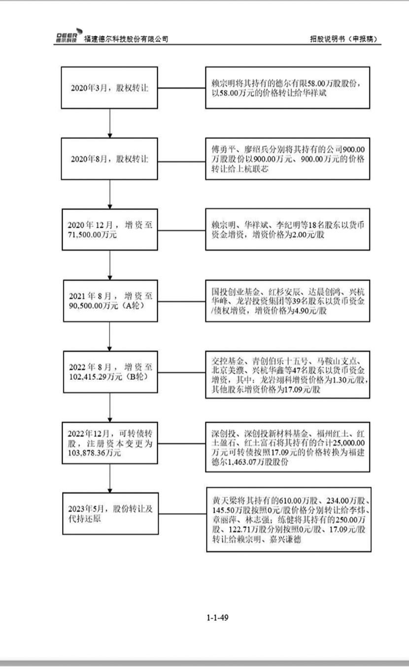 尤其在章丽萍以2.50元/注册资本向黄天梁购买德尔有限234万元注册资本时,其入股时间一直持续到2021年8月。但就在2021年7月15日,公司召开股东会并作出决议,同意其注册资本由71500万元变更为90500万元。本次新增注册资本19000万元,由国投创业基金、红杉安辰、达晨创鸿、龙岩投资集团、深创投等39名股东认购。上述增资于2021年8月6日完成工商登记变更,当时的认购价格为4.90元/注册资本。对比可见,章丽萍受让黄天梁股权的价格与公司的上述机构融资价格相差高达96%。