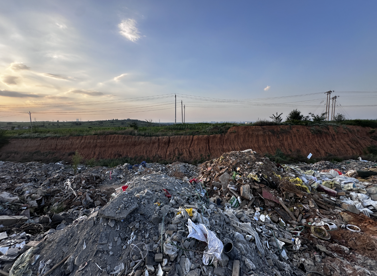 山沟两侧堆放建筑垃圾:废砖废石、废弃电缆、废弃钢筋、废弃塑料板、废弃遮盖用绿网……有的散乱堆放,有的则用编织袋装着;中间则堆放着10余米高,未被分类处理的生活垃圾。垃圾场紧邻二广高速,从航拍画面看,垃圾场像是玉米地里一条裂开的“伤疤”。
