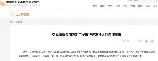 公告标题直指,交易商协会加强对广发银行等发行人的自律调查,原因是在对该行2025-2026年度二级资本债券项目6家中标主承销商的自律调查中发现,其涉嫌存在引导价格等情形。