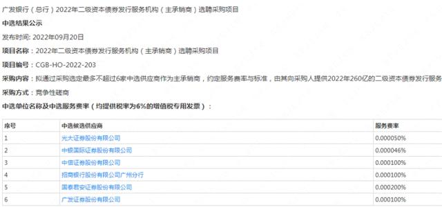 作为对比,2022年,广发银行曾对260亿元二级资本债券发行招标主承销商,同样是以竞争性磋商选定了6家金融机构,分别为光大证券、中银国际证券、中信证券、招商银行、国泰君安证券、广发证券。