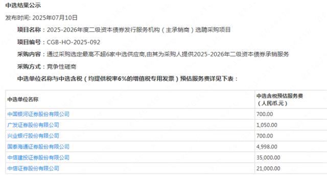 7月10日,广发银行公示债券项目主承销商中选名单,中国银河证券、广发证券、兴业银行、国泰海通证券、中信建投证券以及中信证券6家金融机构,中标广发银行2025-2026年度二级资本债券承销服务。
