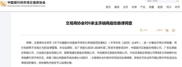 这场自律调查风暴始于10日前。7月11日,交易商协会宣布,对广发银行2025-2026年度二级资本债项目的6家主承销商——中国银河证券、广发证券、兴业银行、国泰海通证券、中信建投证券和中信证券启动自律调查。