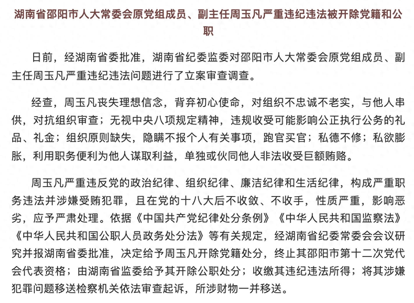周玉凡严重违反党的政治纪律、组织纪律、廉洁纪律和生活纪律,构成严重职务违法并涉嫌受贿犯罪,且在党的十八大后不收敛、不收手,性质严重,影响恶劣,应予严肃处理。依据《中国共产党纪律处分条例》《中华人民共和国监察法》《中华人民共和国公职人员政务处分法》等有关规定,经湖南省纪委常委会会议研究并报湖南省委批准,决定给予周玉凡开除党籍处分,终止其邵阳市第十二次党代会代表资格;由湖南省监委给予其开除公职处分;收缴其违纪违法所得;将其涉嫌犯罪问题移送检察机关依法审查起诉,所涉财物一并移送。