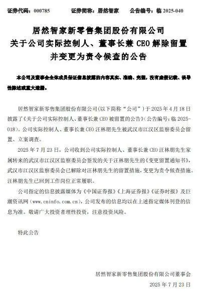 7月23日,居然智家发布公告,称收到公司实际控制人、董事长兼CEO汪林朋家属转来的武汉市江汉区监察委员会签发的关于汪林朋的《变更留置通知书》。根据该通知书,武汉市江汉区监察委员会已解除对汪林朋的留置措施,变更为责令候查措施。