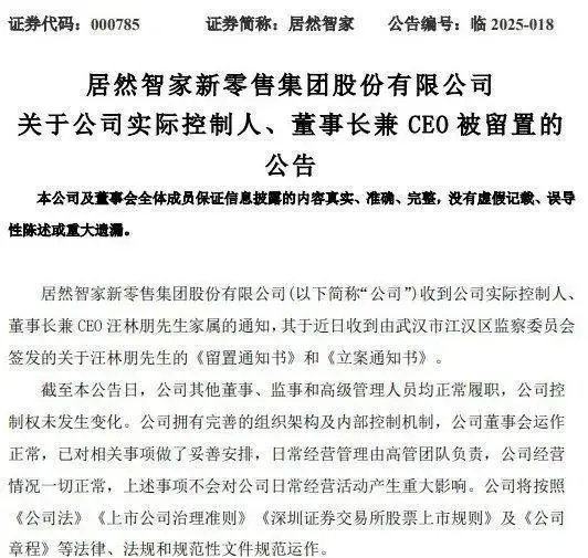 2025年4月17日,居然智家公告,公司收到公司实际控制人、董事长兼CEO汪林朋家属的通知,其于近日收到由武汉市江汉区监察委员会签发的关于汪林朋的《留置通知书》和《立案通知书》 ;4月18日,居然智家开盘一字跌停;同日,公司查询到汪林朋直接持有的3.72亿股股份被司法冻结,包括2.79亿股高管限售股份,冻结起始日为2025年4月17日,到期日为2025年10月16日,此次冻结股份占汪林朋直接所持股份的100%,占公司总股本的5.97%。