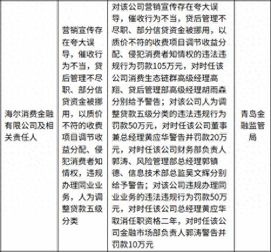 具体看,国家金融监督管理总局青岛监管局对该公司营销宣传存在夸大误导,催收行为不当,贷后管理不尽职、部分信贷资金被挪用,以质价不符的收费项目调节收益分配、侵犯消费者知情权的违法违规行为罚款105万元,对时任该公司消费生态链群高级经理高翔、贷后管理部高级经理胡雨森分别给予警告;