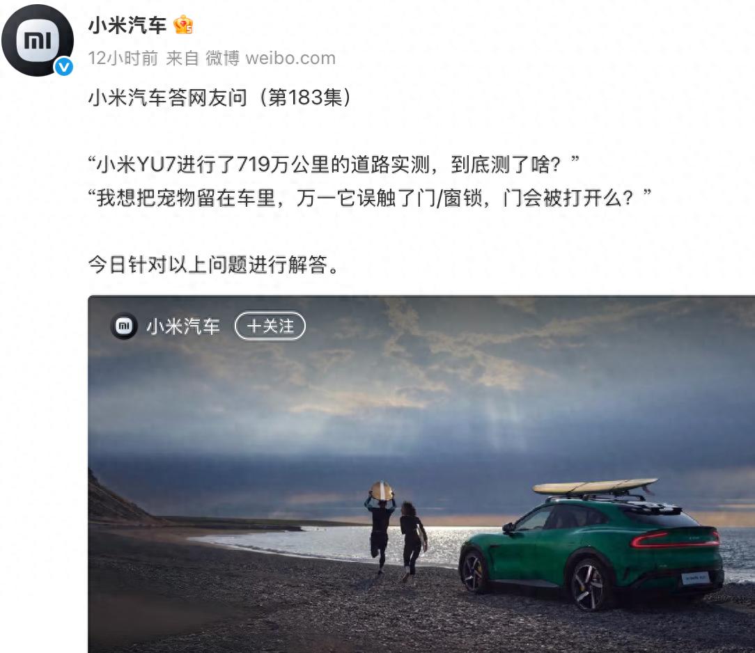7月25日消息,小米汽车今日发布《答网友问》第 183 集,集中披露小米 YU7 SUV 道路实测、宠物模式、雨天行车及家用充电方案的最新进展。