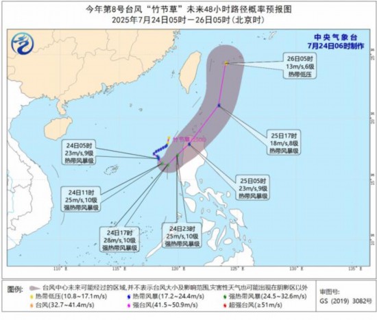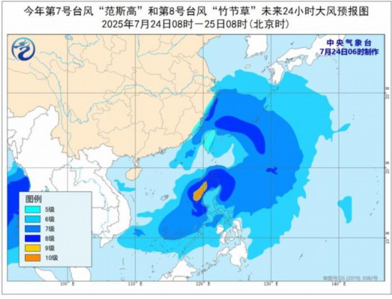 大风预报:7月24日08时至25日08时,受“范斯高”和“竹节草”的共同影响,东海大部、台湾海峡、台湾以东洋面、巴士海峡、南海东部和南部、杭州湾、浙江沿海、福建沿海、台湾岛沿海将有6~8级、阵风9~10级大风,其中,南海东部的部分海域风力可达9~10级、阵风11~12级。