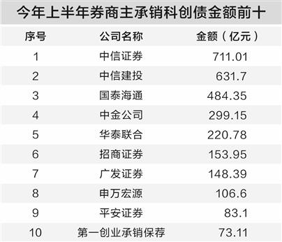 具体而言,从科创债的承销家数和承销金额来看,今年上半年排名前五的券商为中信证券、中信建投、国泰海通、中金公司和华泰联合。从承销金额来看,中信证券达711.01亿元,中信建投为631.7亿元,国泰海通484.35亿元,中金公司299.15亿元,华泰联合为220.78亿元。与去年的榜单前五相比,华泰联合为新晋券商。
