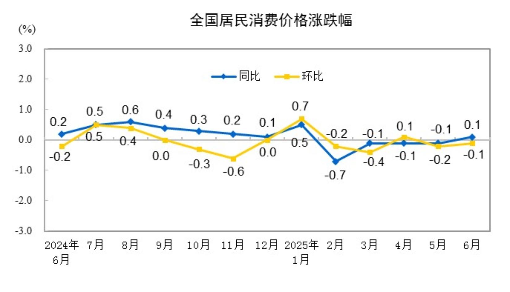 国家统计局数据显示,2025年6月,全国CPI同比上涨0.1%,在连续下降4个月后转涨;环比下降0.1%,降幅比上月收窄0.1个百分点。核心CPI同比上涨0.7%,创近14个月以来新高。
