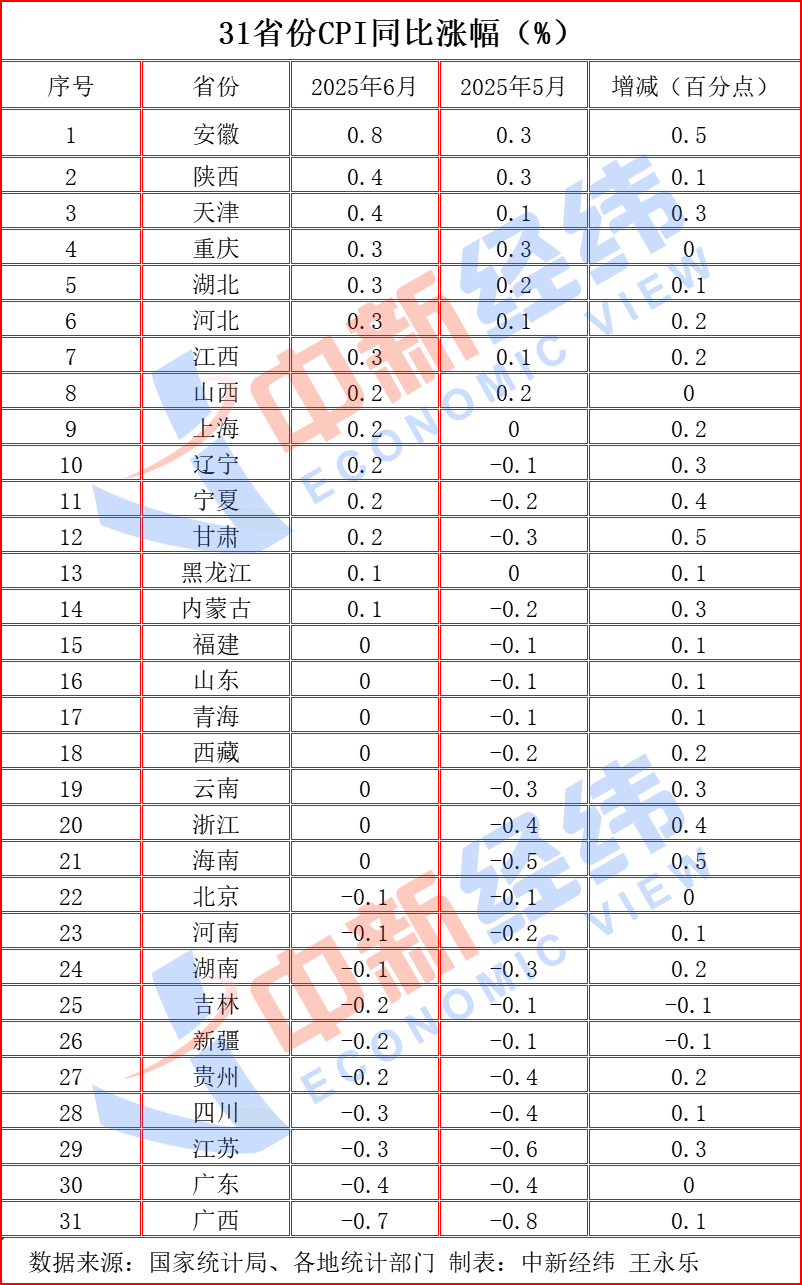 随着河北、山东等地公布2025年6月居民消费价格指数(CPI),31省份6月CPI出齐。中新经纬梳理发现,6月,14省份CPI同比上涨。