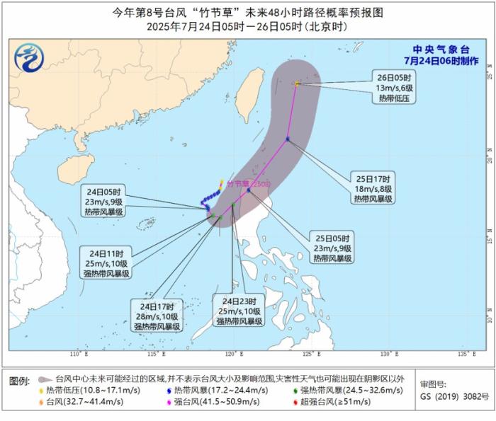预计,“竹节草”将先以每小时10-15公里的速度向东南方向移动,强度还将有所增强,24日傍晚开始转向东北方向移动,逐渐向菲律宾吕宋岛西北部沿海靠近,24日夜间至25日上午在吕宋岛西北部沿海登陆(23-28米/秒,9-10级,热带风暴级或强热带风暴级),尔后进入巴士海峡并趋向台湾以东洋面,强度逐渐减弱。