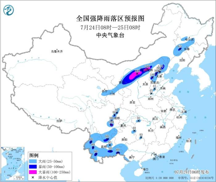 预计,7月24日08时至25日08时,内蒙古中西部偏南地区、宁夏中北部、陕西北部、山西北部、河北中北部、天津北部、北京中东部、河南东北部、四川南部和盆地西部、贵州东部和南部、湖北西南部、云南、广西西部以及青海东北部、甘肃东部、吉林中西部、黑龙江南部等地部分地区有大到暴雨,其中,内蒙古中西部偏南地区、山西北部、河北西部、北京东北部、四川盆地西南部等地局地有大暴雨(100~180毫米)。上述部分地区伴有短时强降水(最大小时降雨量20~50毫米,局地可超过70毫米),局地有雷暴大风等强对流天气。