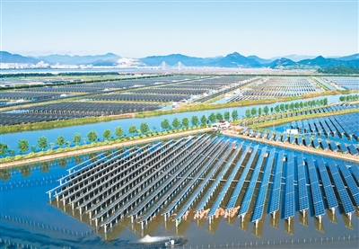 棚上太阳能电池板可发电,棚下可养蛏、蛤、虾、青蟹——浙江省宁波市宁海县一市镇的海产养殖塘发展“渔光互补”新模式,带动地方经济生态双丰收。林利军摄(人民视觉)
