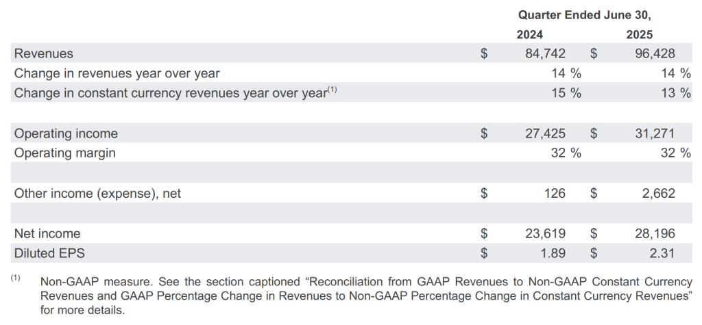 当地时间7月23日美股盘后,谷歌母公司Alphabet发布了截至6月30日的2025年第二季度财报。财报显示,Alphabet第二季度实现营收964.28亿美元,同比增长14%,高于市场预期的940亿美元;非美国通用会计准则下(Non-GAAP)净利润为281.96亿美元,同比增长19%;摊薄后每股收益为2.31美元,高于市场预期的2.18美元。