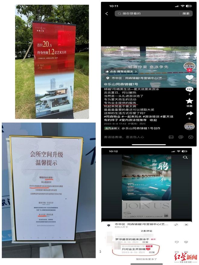 该小区业主提供的抖音号“乐山同森锦樾1号”截图显示,在宣传会所泳池的活动中,出现“专为业主提供服务”的表述,有附近小区业主留言咨询是否能来游泳时,该账号回复称“只对业主开放”。此外,会所空间升级提示牌上曾出现“业主专享 尊贵礼遇”字样。