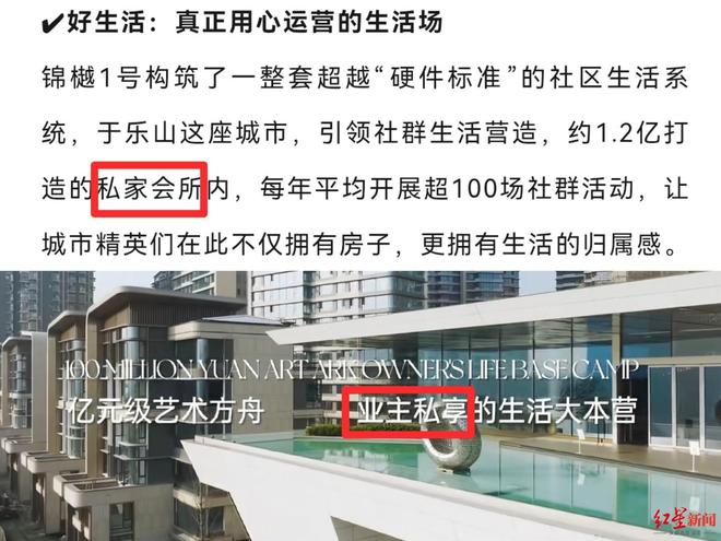 7月22日,红星新闻记者在微信公众号“同森乐山锦樾1号”中搜索发现,该公司两个月前发布的一篇文章中称,“约1.2亿打造的私家会所内,每年平均开展超100场社群活动,让城市精英们再次不仅拥有房子,更拥有生活的归属感。”