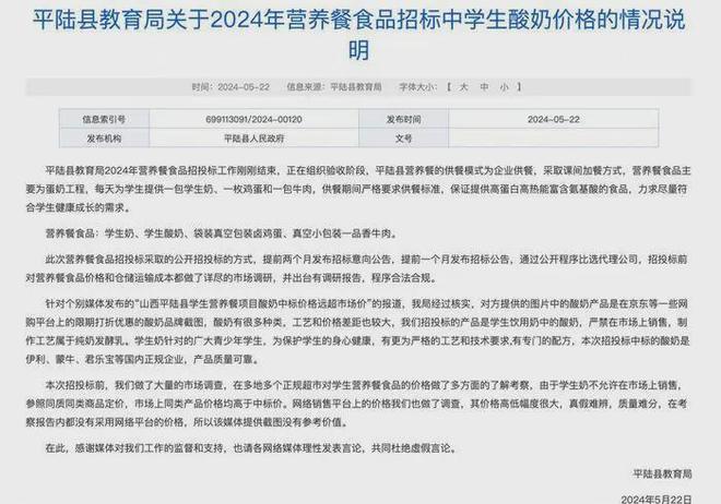 2024年5月,“山西平陆县学生营养餐项目酸奶中标价格远超市场价”一事经媒体报道后引发广泛关注。随后,在《平陆县教育局关于2024年营养餐食品招标中学生酸奶价格的情况说明》中,平陆县教育局(现平陆县教育体育局)称媒体报道中所引用的酸奶市场价格不具有参考价值,并强调其营养餐食品招投标程序合法合规。
