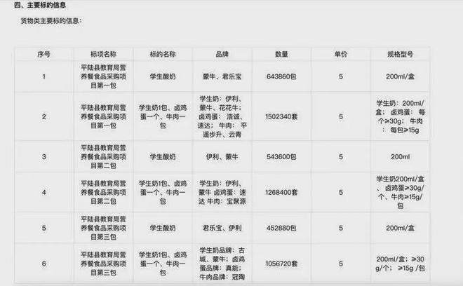 据媒体报道,2024年5月14日,山西省政府采购网曾披露《平陆县教育局营养餐食品采购项目结果公告》,而据该公告披露,三家中标公司所提供的200ml/盒的蒙牛、君乐宝、伊利等品牌酸奶价格皆为5元,远高于市场价格。