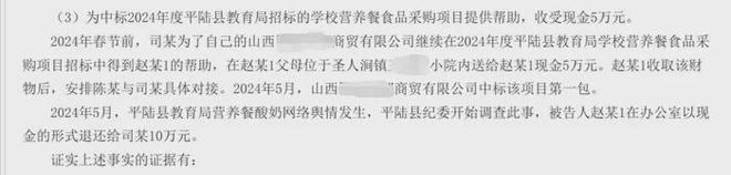 值得一提的是,上述判决书还载明,2024年5月,平陆县教育局营养餐酸奶网络舆情发生,平陆县纪委开始调查此事,赵兴辉在办公室以现金形式退还给司某10万元。