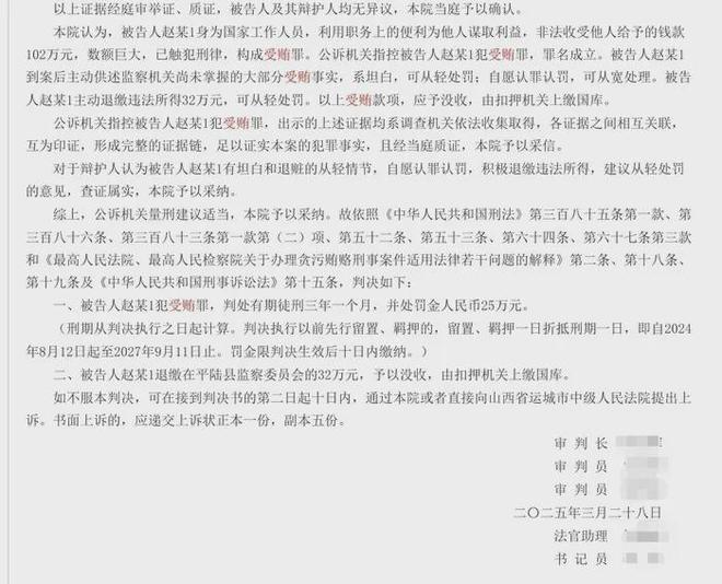 在判决书中,法院认为,赵兴辉身为国家工作人员,利用职务上的便利为他人谋取利益,非法收受他人给予的钱款102万元,数额巨大,已触犯刑律,构成受贿罪。2025年3月28日,平陆县法院一审判决赵兴辉犯受贿罪,判处有期徒刑三年一个月,并处罚金25万元。7月23日,记者从平陆县官方人士处证实上述判决。