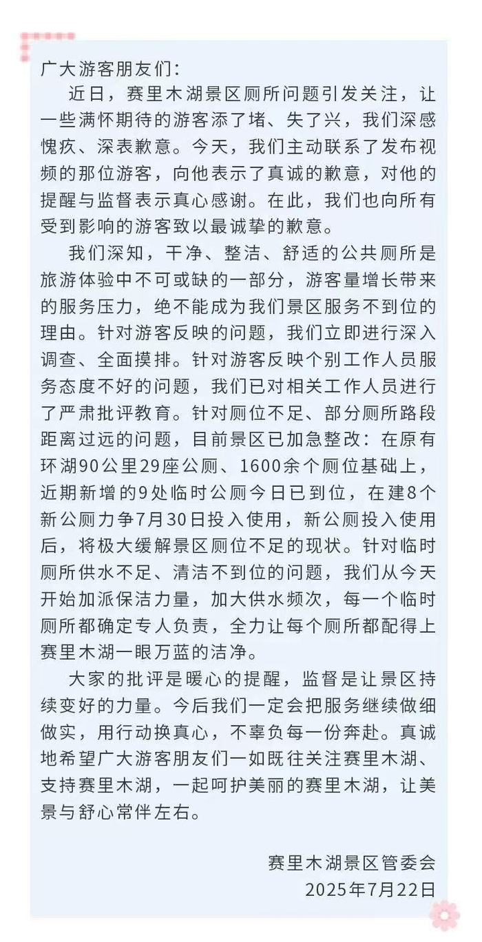 在公开致歉信中,景区管委会表示,近日赛里木湖景区厕所问题引发关注,让一些满怀期待的游客添了堵、失了兴,对此深感愧疚、深表歉意。