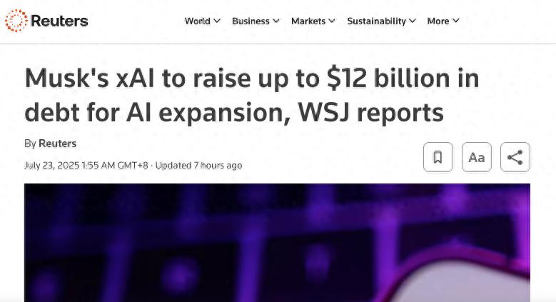 7月23日消息,据多家外媒报道,埃隆·马斯克旗下人工智能初创公司xAI正与一家未具名金融机构合作,计划为扩张计划筹集至多120亿美元资金。这笔资金将主要用于大规模采购英伟达最新一代AI芯片,并租赁给xAI用于建设一座专为训练和运行其AI聊天机器人Grok的大型数据中心。