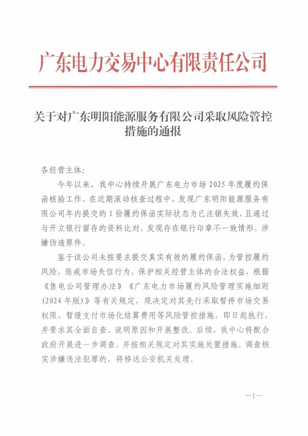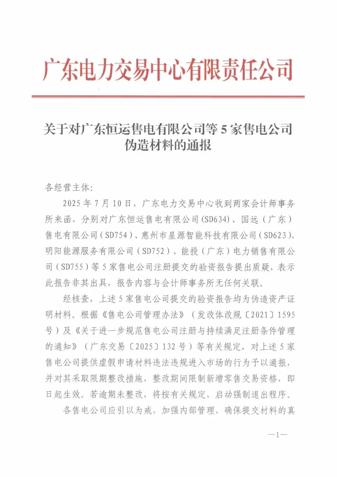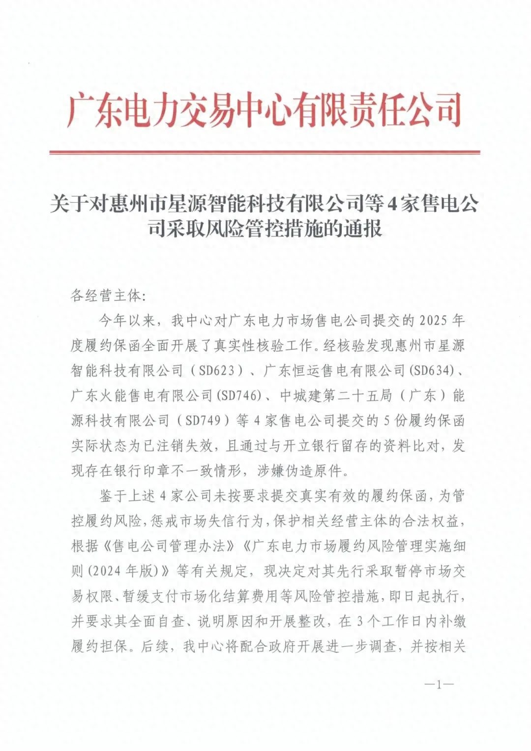 近日,广东电力交易中心发布公告,通报对多家公司采取风险管控措施:《关于对惠州市星源智能科技有限公司等4家售电公司采取风险管控措施的通报》《关于对广东明阳能源服务有限公司采取风险管控措施的通报》《关于对广东恒运售电有限公司等5家售电公司伪造材料的通报》。