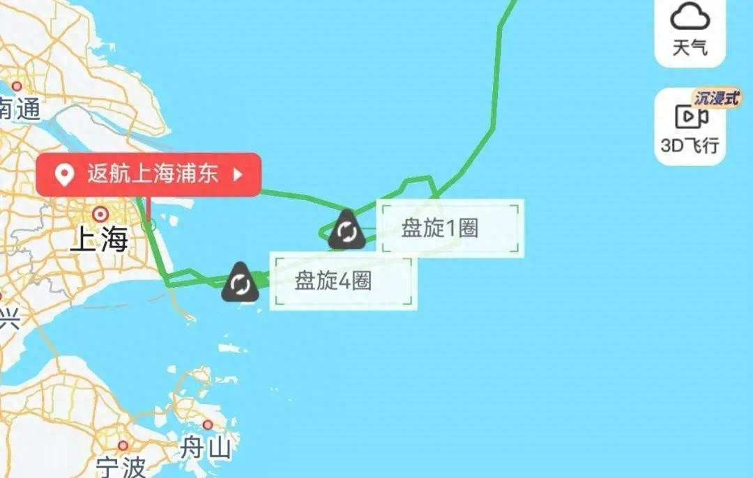 记者从航旅纵横App看到,该航班由空客A350-900执飞,由上海浦东飞往悉尼金斯福德,“飞行实况”显示航班起飞后在长江口上空持续盘旋约5圈,最终返航浦东机场。
