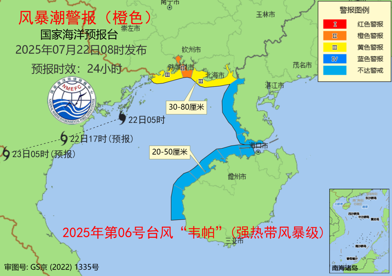 风暴潮方面,预计7月22日白天,广西沿海和广东雷州半岛西岸沿海将出现30到80厘米的风暴增水,海南岛西部沿海将出现20到50厘米的风暴增水。广西钦州市的风暴潮预警级别为橙色,广西北海市和防城港市的风暴潮预警级别为黄色。预计22日傍晚解除风暴潮警报。请沿海政府及相关部门按照职责做好防御风暴潮的应急准备工作;各涉海相关生产单位采取积极有效的措施,组织渔船、养殖渔排、养殖场等做好防御工作;加固沿海渔业养殖水产设施和渔港设施,做好防潮准备。