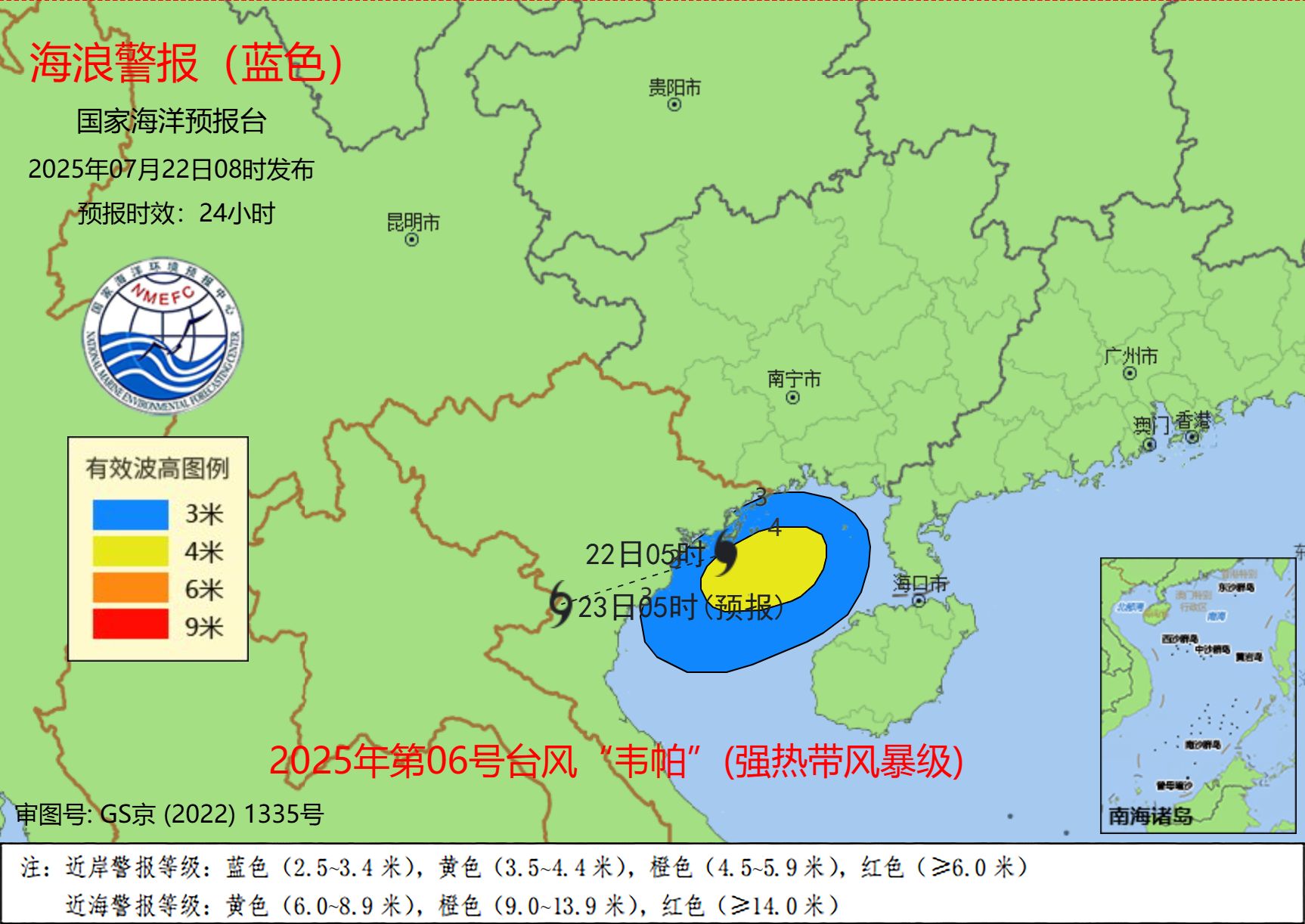 海浪方面,预计7月22日白天,北部湾将出现3到5米的大浪到巨浪区;广西、海南近岸海域将出现2到3米的中浪到大浪,近岸海域海浪预警级别为蓝色。请在上述海域作业的船只注意安全,沿海各有关单位提前采取防浪避浪措施。
