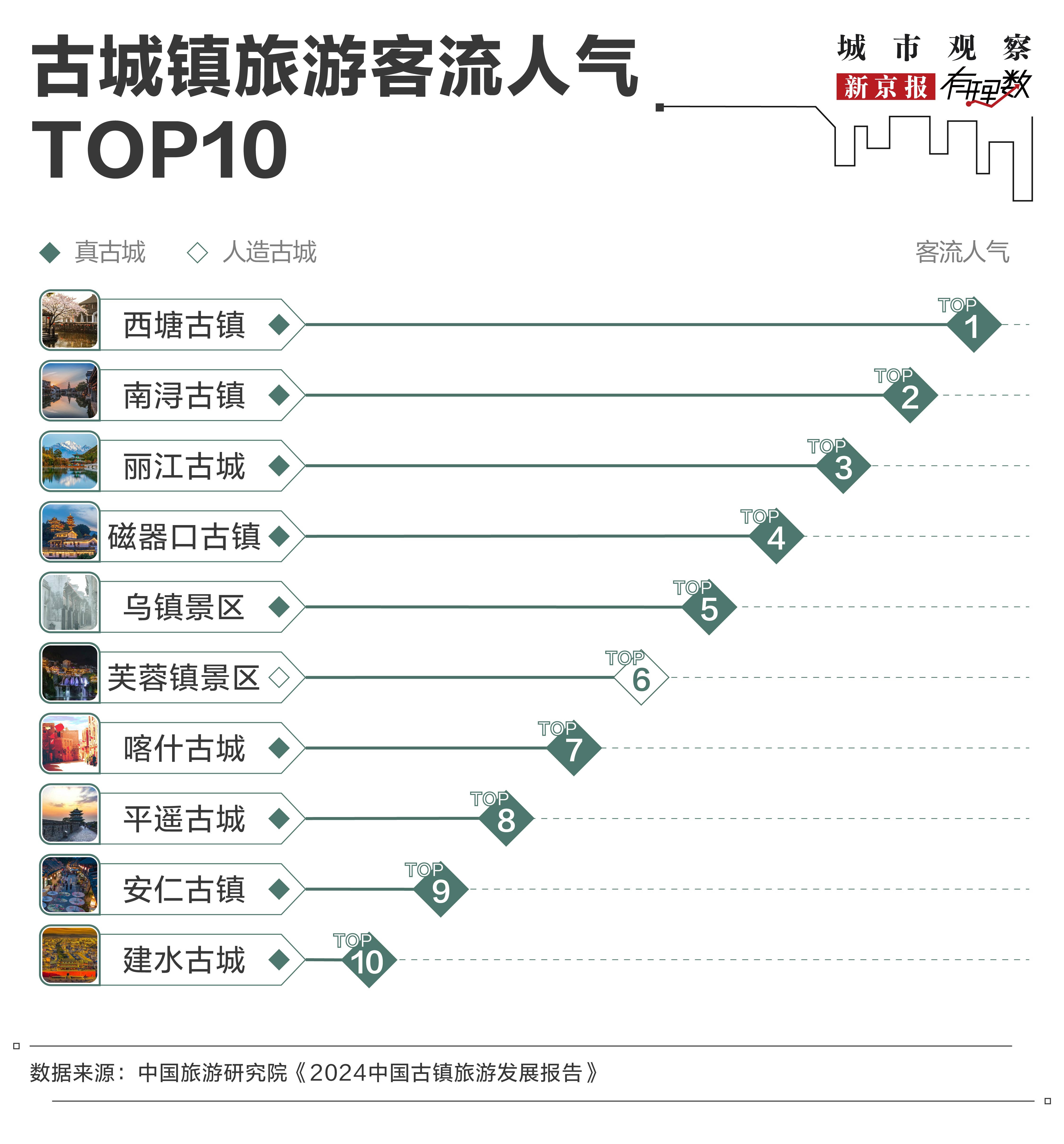 在客流TOP10古镇中,有9个是像乌镇、西塘、南浔这样,基于历史生态重新修复的古城,相比之下,缺乏历史脉络、运营能力欠佳的人造古城则鲜有上榜。