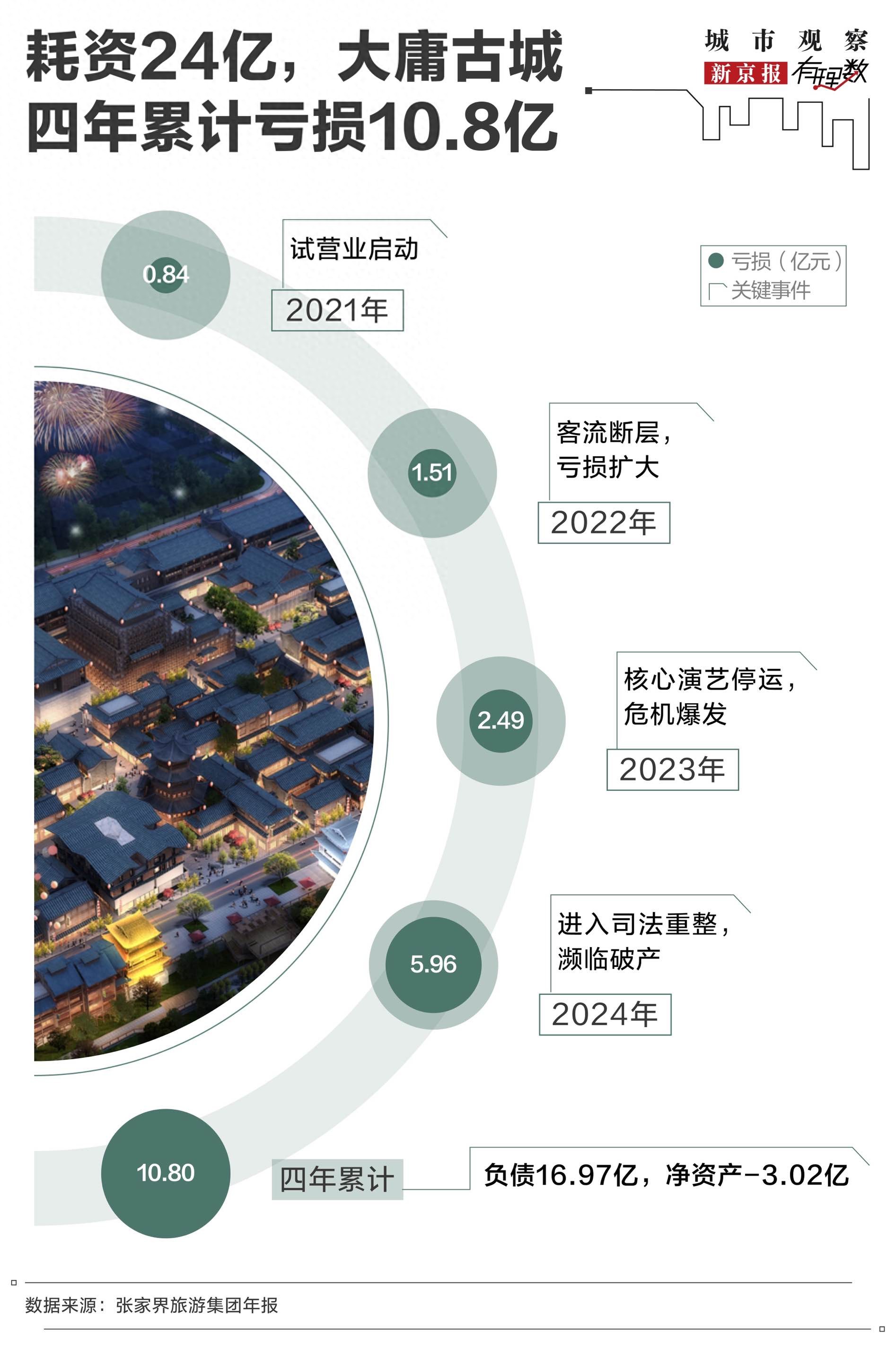 然而,2021年6月试运营以来,该项目的经营状况却不尽如人意。据央视《焦点访谈》深度调查,截至2024年末,大庸古城项目累计亏损超过10亿元,其中,仅2024年单年就亏损了5.96亿元。这座斥巨款打造的古城,现如今正深陷持续亏损的泥潭。