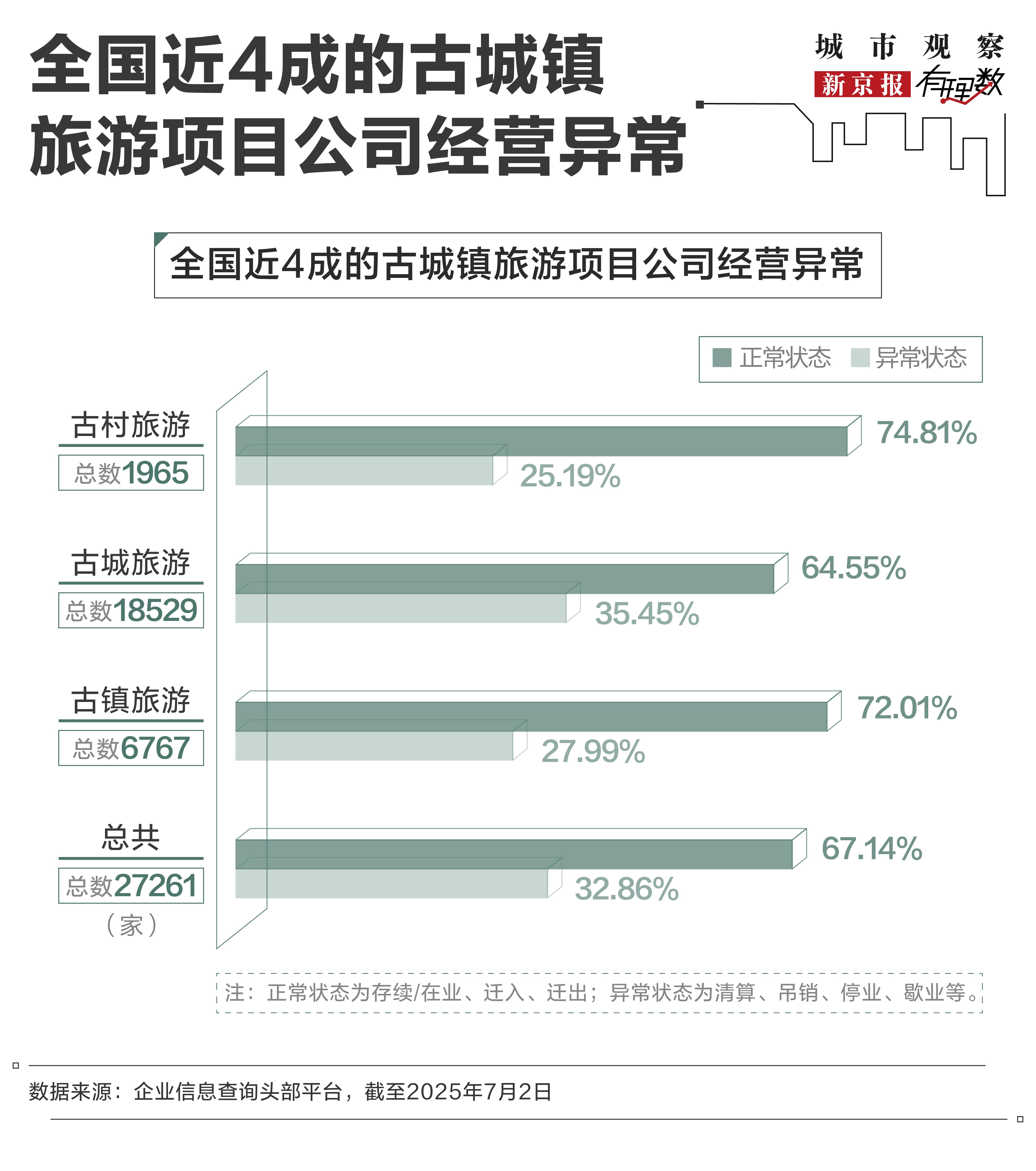 然而,企业信息查询平台数据显示,全国27000余家古城镇相关旅游企业中,有近4成企业经营状况不佳,处于清算、停业、歇业等异常状态。现存古城镇旅游企业多数挣扎在亏损边缘。