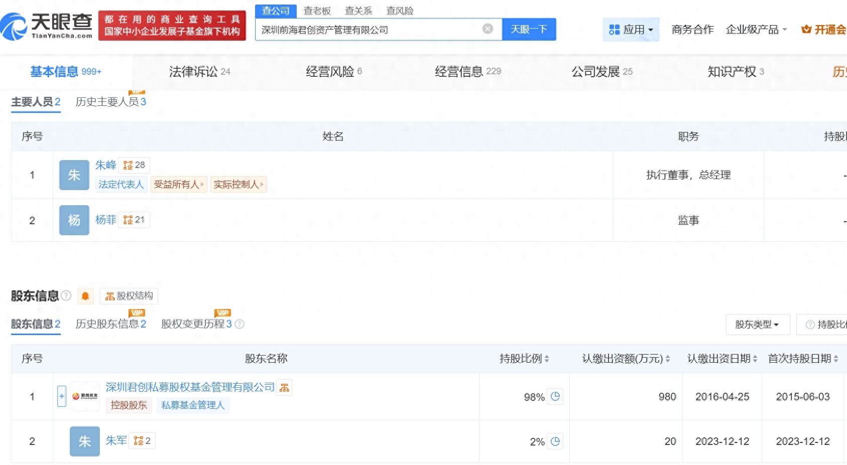 据天眼查公开信息,君创私募成立于2014年,曾用名为深圳前海君创基金管理有限公司、深圳前海君联同创投资管理有限公司,法定代表人为朱峰,持股比例为70%。